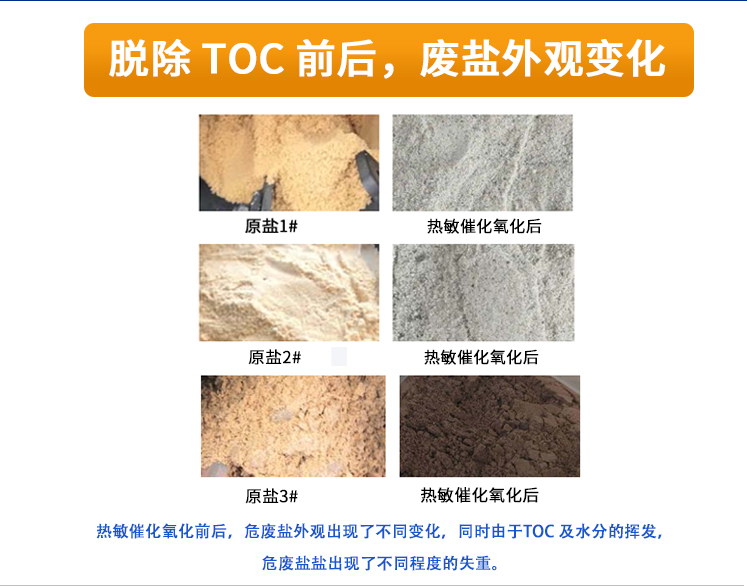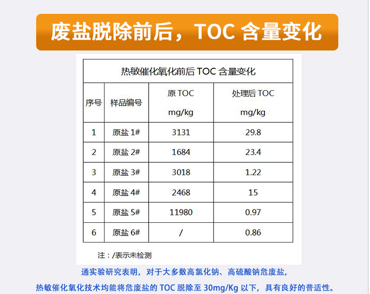 危廢固鹽是指從化工、醫(yī)藥等行業(yè)高濃含鹽有機廢水中回收的廢鹽。危廢鹽若處理不當,會直接導致地表水、地下水污染,嚴重污染土壤,破壞生態(tài)環(huán)境,導致土地鹽堿化,惡化農(nóng)業(yè)生產(chǎn)環(huán)境。熱敏催化氧化技術能將危廢鹽的 TOC 脫除至 30mg/Kg 以下,具有良好的普適性。