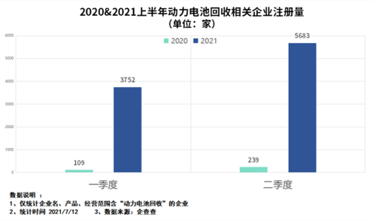 同時(shí),我國(guó)現(xiàn)存“動(dòng)力電池回收”相關(guān)企業(yè)共1.5萬(wàn)家。2020年是企業(yè)注冊(cè)量的高峰期,全年新增2579家,同比增長(zhǎng)253.3%;今年上半年新注冊(cè)了9435家,同比增長(zhǎng)2611.2%。