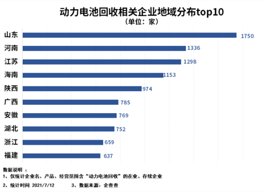 從地域分布來(lái)看,動(dòng)力電池回收相關(guān)企業(yè)主要分布在山東、河南、江蘇等省份。其中山東排名第一,共1750家相關(guān)企業(yè)。河南排名第二,共1336家;江蘇排名第三,共1298家相關(guān)企業(yè)。