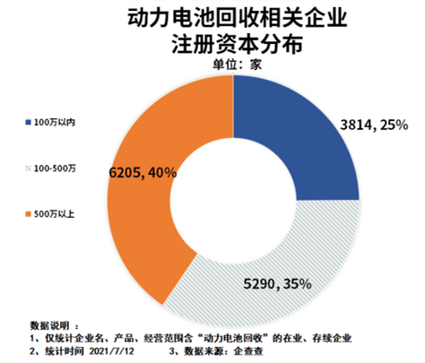 從注冊(cè)資本來(lái)看,企查查數(shù)據(jù)圖顯示,動(dòng)力電池回收相關(guān)企業(yè)注冊(cè)資本在100萬(wàn)元以內(nèi)的企業(yè)數(shù)量占25%,注冊(cè)資本在100-500萬(wàn)元和500萬(wàn)元以上的分別占35%和40%。