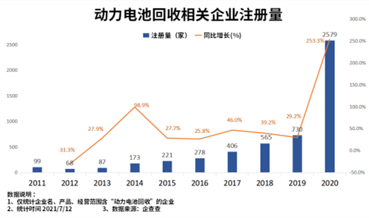 從近十年動(dòng)力電池回收相關(guān)企業(yè)發(fā)展?fàn)顩r來(lái)看,2020年是企業(yè)注冊(cè)量進(jìn)入爆發(fā)期,全年共注冊(cè)了2579家企業(yè),同比增長(zhǎng)253.3%。