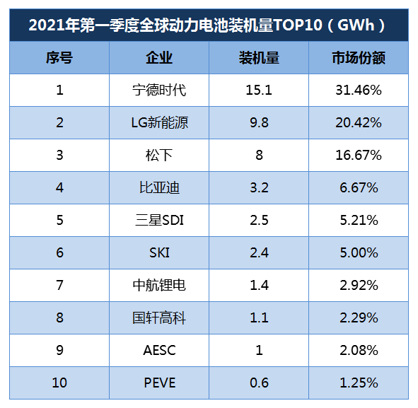 其中,寧德時代強勢霸榜,一季度電池裝機量同比增長320.8%至15.1 GWh,市占率從2020年全年的25%再度擴大至31.5%。而其最大競爭對手LG化學(xué)、松下市占率則分別下降至20.5%、16.7%,松下市占率一年內(nèi)下降近10個百分點。